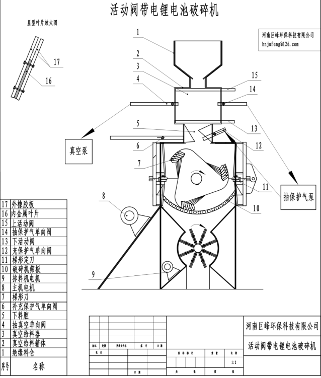 鋰電池經(jīng)絕緣倉進活動閥真空給料,下閥關(guān)上閥開,進料后上閥關(guān),關(guān)后抽空,抽后下閥開入破室,下閥關(guān)給料器腔抽氣,完成給料工序;物料經(jīng)Z腔至破室,Z腔防止物料反彈,破室在貧氧狀(破碎室含氧量在小于2%以下可保證帶電破碎的正常安全性),破室進出料閉氧抽空充惰性氣體(常規(guī)用氮氣和二氧化碳);惰性氣體作用為提高電解液閃點和揮發(fā)點,同時抑制鋰離子從負(fù)極到正極幾率,防止放電發(fā)熱和爆燃;鋰電破碎時轉(zhuǎn)子刀與底刀相切破,并起摩擦打散防止金屬殼體包裹正負(fù)極片,碎后物料通過真空排料進行外排。